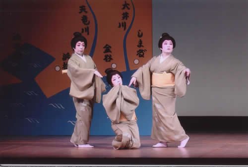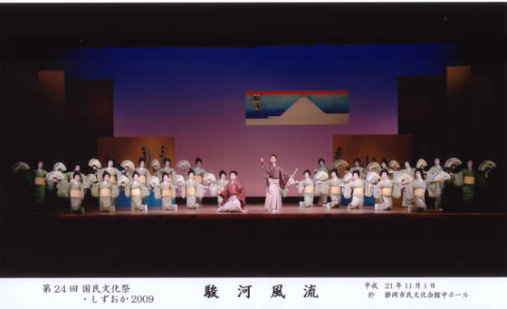 静岡県日本舞踊協会と社団法人日本舞踊協会静岡県支部、二団体の合同作品は長唄「駿河風流」だ。県内各地の風景や民話を唄いこんでいる創作舞踊だ。東部地区で意欲的に活動されていた舞踊家・故花柳実氏が生前、静岡で開催する国民文化祭で是非踊りたいと創作された踊りだ。存命中に国文祭の開催はされなかったが、今回総勢26人もの県内の舞踊家によって、花柳先生の意いを叶えることができた。