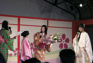 前夜祭の3月30日、駿府公園の大演舞場前で夜桜乱舞を踊るNHK静岡局の生中継があった。バックヤードにいた私の目の前をワゴン車が通過。巽櫓での開門式を終えた御台所と大御所の登場らしい。しかし楽屋用テントに入る時もまったく姿を見ることができなかった。
